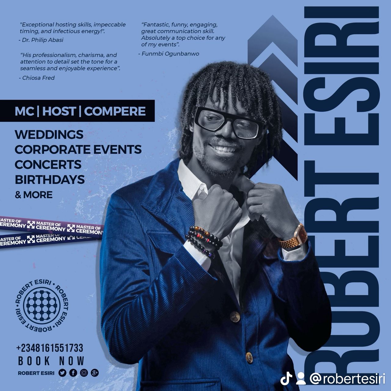 Robert Esiri is not your average MC — I am an experience. With no demographic limits, I bring a dynamic presence to every event, effortlessly engaging audiences of all ages and backgrounds. Whether it's an elegant outdoor wedding, a lively corporate party, or a vibrant community festival, I know how to read the room, set the tone, and keep the energy flowing.